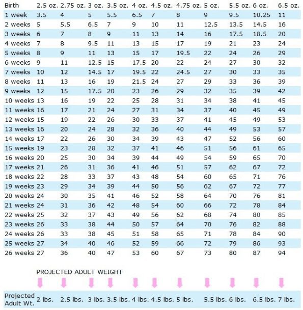 Move across the row corresponding to your puppy’s age to find their current weight (all weights are listed in ounces except for the final adult weight).