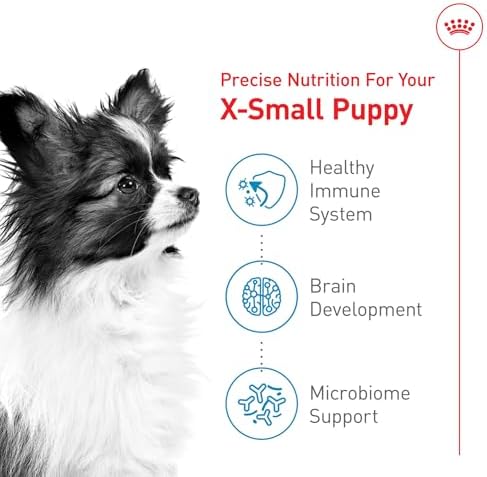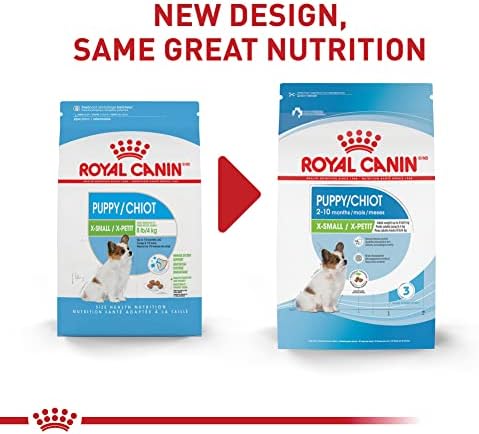 Serve up the targeted nutrition your puppy deserves with Royal Canin(R) Size Health Nutrition X-Small Breed Dry Puppy Food. This extra-small breed puppy food formula has a crunchy dog kibble texture your puppy will love. This puppy dry food formula was created for puppies from 2 to 10 months old with an expected adult weight of no more than 8 lbs. Not only that, but this complete and balanced dry extra-small dog food provides the nutrition to support your puppy’s growth and development. DHA and omega-3 fatty acid help with your puppy’s brain development, while proteins, minerals and vitamins support a puppy’s high energy needs during growth. Antioxidants such as Vitamins E and C help with immune support, and a combination of prebiotics and highly digestible proteins promotes healthy digestion. Promote your puppy’s overall wellness with every Royal Canin X-Small Breed Dry Puppy Food serving.